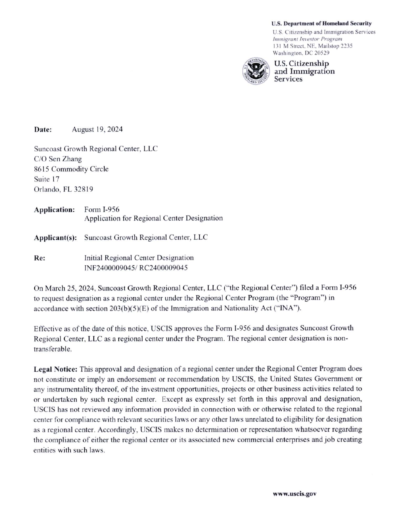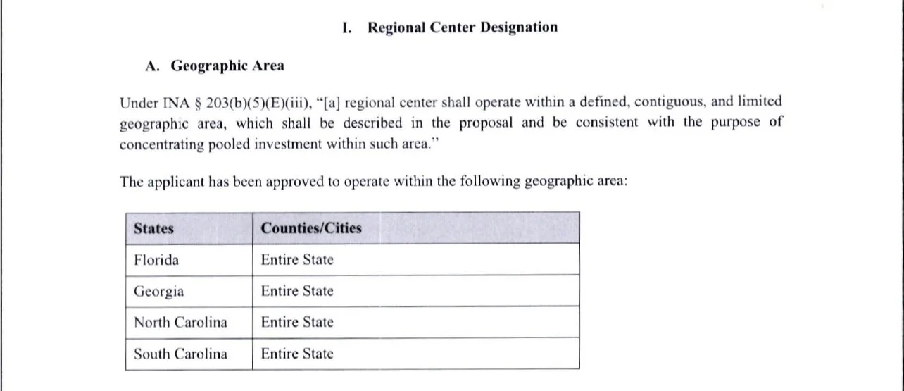 Greenfield Fund Management 独家合作的区域中心获移民局批准,区域包括佛罗里达,乔治亚,北卡罗莱纳和南卡罗莱纳四个州。