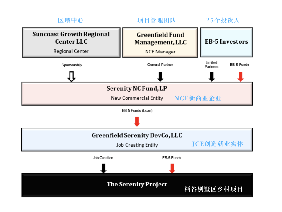 25个投资者作为有限合伙人加入NCE,并通过签署PPM(认购协议)来将80万美金投入到NCE中,NCE将EB5资金以贷款的形式提供给JCE创造就业实体,由JCE完成就业要求。(本项目通过土地开发完成就业)