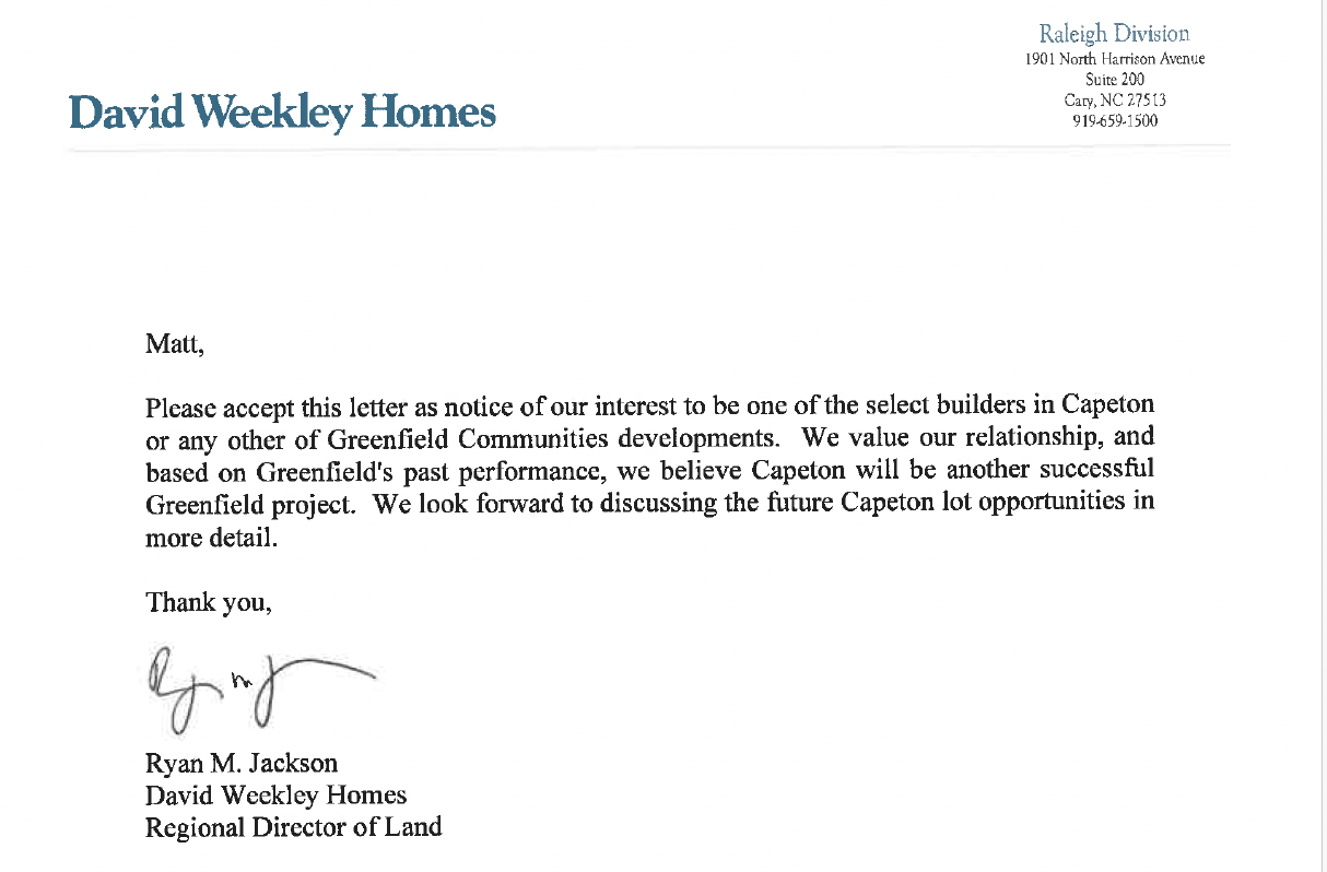 项目近况 项目概况 项目近况 Capeton整体社区的分区用途(Zoning)早在2021年获得批准,项目已于2025年11月开工。项目只做土地平面开发,以优秀姐妹项目Serenity为参考,其一期期开发一期期交付的属性,使项目进展清晰可见,而其每月花费也较为固定。2025年11月现场实拍图: 目前项目已获得David Weekley Homes与Garman Homes的购地意向函。并已与总承包商Iron Horse签署了TR1,TR2 合计约19M的建筑合同。此外项目受政府支持,政府将资助部分道路修建。 项目计划 项目位置